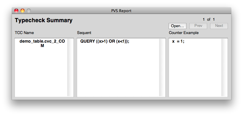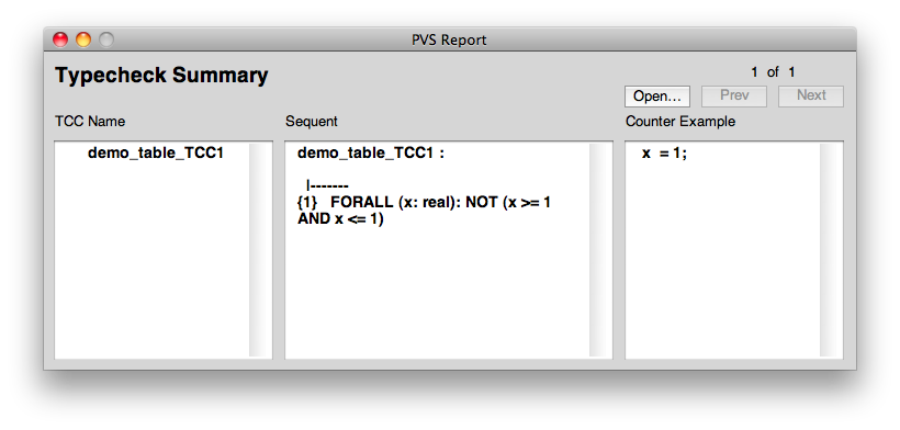 The Typecheck summary window will display the formula for which a proof was not found. If a proof fails PVS attempts to find a counter example. In this senario pvs has found that a counter example to the formula is x = 1. When a counter example is found the tool will give visual feedback on which conditions were true and which were false for that counter example. A condition coloured red indicates that the condition was false for the given counter example, a green colour indicates that a condition is true. For this example we can see that both possible conditions are false for the counter example indicating to the table designer that they failed to consider a case of the input.